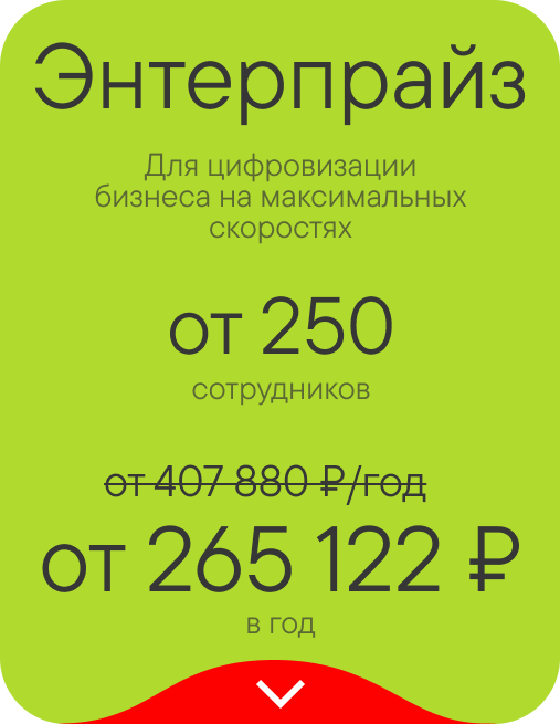 — Акция действует для клиентов тарифа Энтерпрайз, повышающих свой тариф до Энтерпрайза с большим количеством пользователей, при покупке на 1 год.